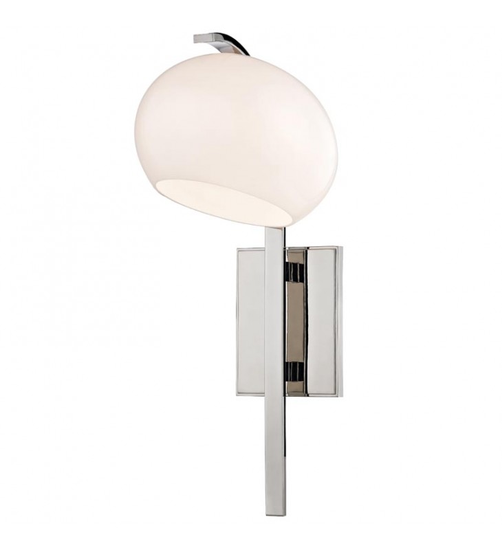 Complementing the arc of its arm, Perrault? white oval glass shade is cut on the bias. This 45?-angle cut makes an elongated and unusual opening. The rectangular orientation and defined edges of Perrault? backplate and arm provide satisfying contrast to the wide curves of its diffuser.