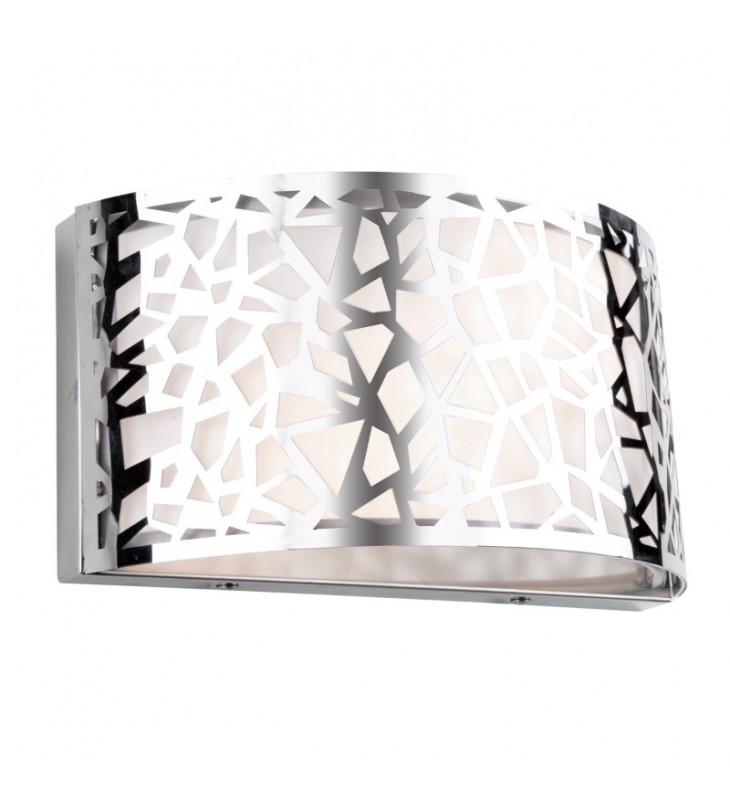 The \"Bayview\" collection has a chrome plated exterior metal frame which has multi shape cuts throughout. The chrome shade overlaps a white hardback shade.