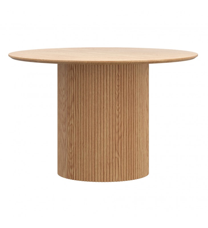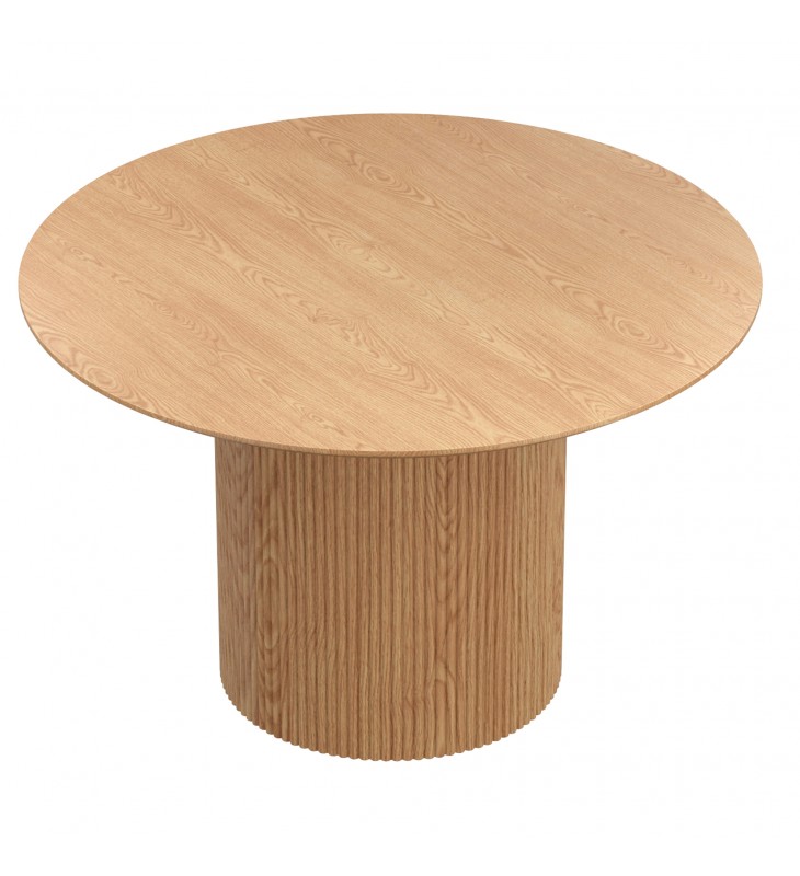 Mid-century modern round dining table; Wide pedestal, engineered wood base with reeded detail and laminated veneer; Engineered wood table top with oak veneer; Reverse bevel table top with visible wood grain finish; Mix and match with a variety of chair styles and finishes