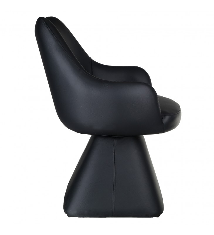 Contemporary dining side chair; Automatic return swivel seat; Faux leather-upholstered seat and base; Medium comfort polyester foam cushion; Approximate weight capacity is 300 lbs; seat height is 19.5\"