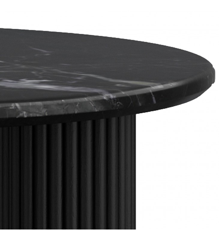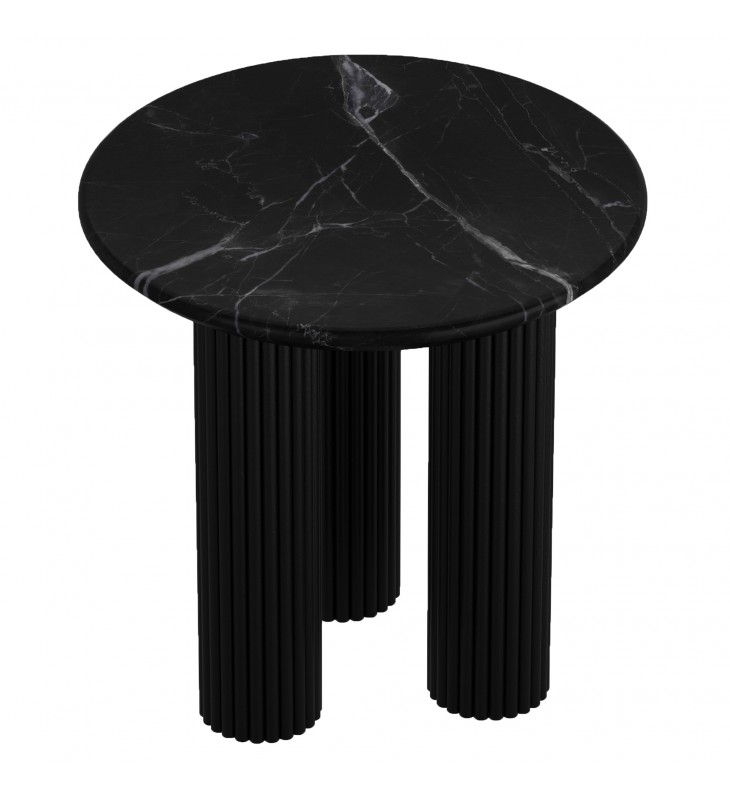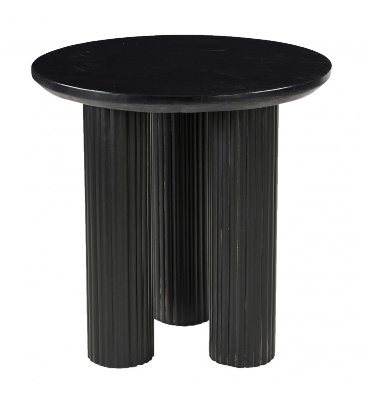 Mid-century modern round accent table; Triple pedestal solid mango wood reeded base in a black finish; Thick, bevelled, black marble table top; Natural variations will occur in mango wood and marble slabs; Eco-friendly solid wood materials sourced from sustainable plantations
