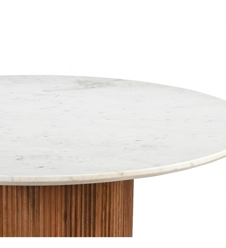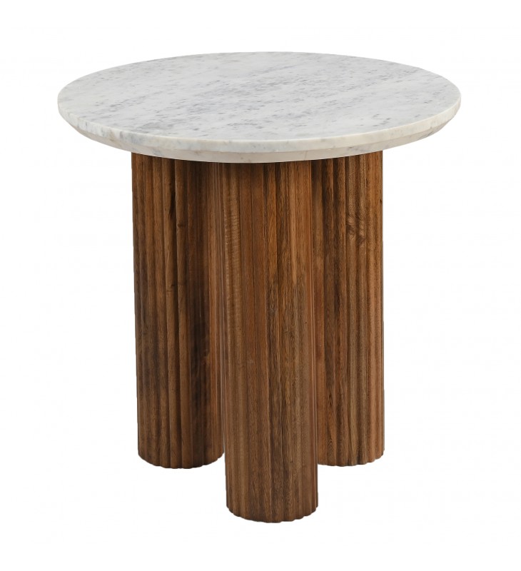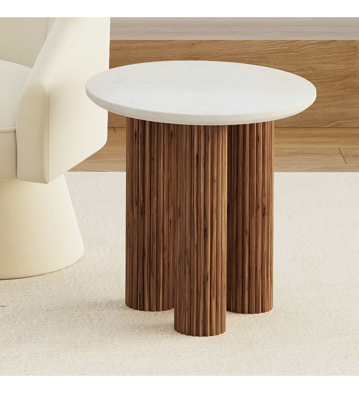 Mid-century modern round accent table; Triple pedestal solid mango wood reeded base in a walnut finish; Thick, bevelled, white marble table top; Natural variations will occur in mango wood and marble slabs; Eco-friendly solid wood materials sourced from sustainable plantations