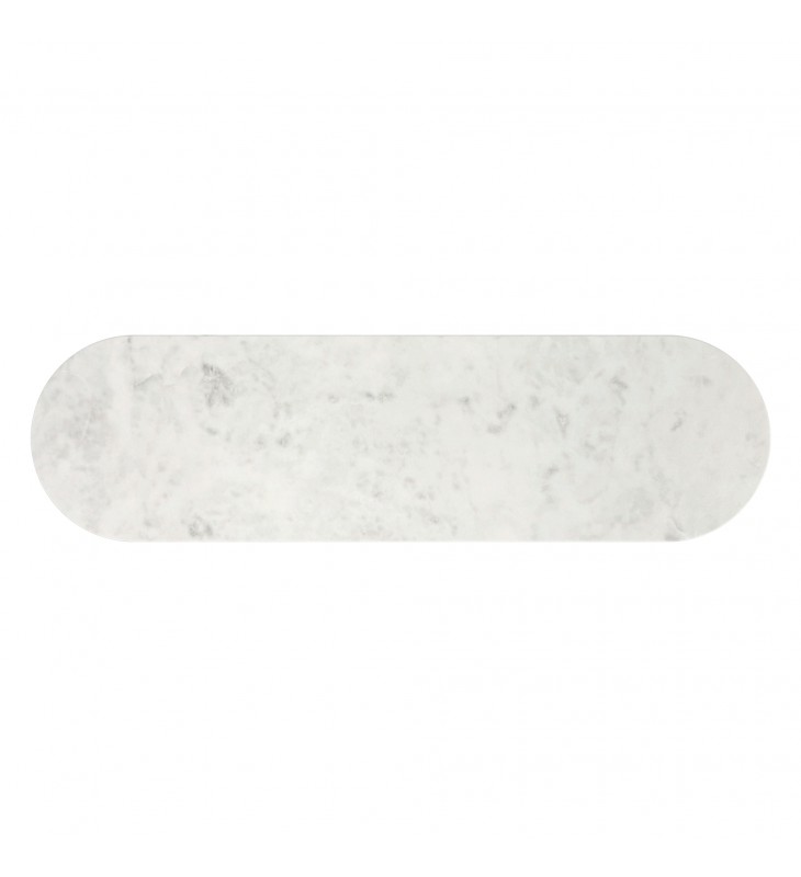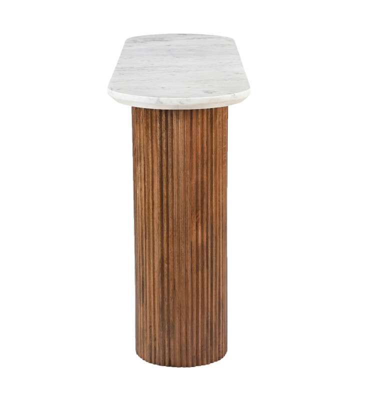 Mid-century modern oval console table; Double pedestal solid mango wood reeded base in a walnut finish; Thick, bevelled, white marble table top; Natural variations will occur in mango wood and marble slabs; Eco-friendly solid wood materials sourced from sustainable plantations