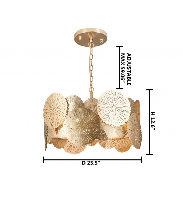 Product Feature : This modern ceiling fixture has a copper metal frame with a bottom acrylic cover There are metal petal leaf accents around the frame, adding even more modern This fixture is hung by a 59" chain that can be adjusted to your liking.