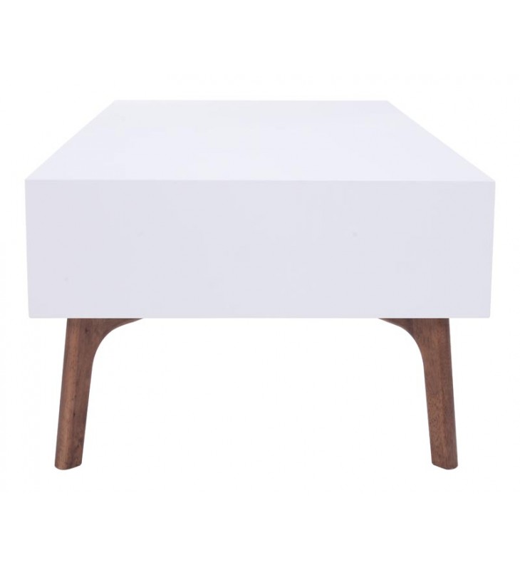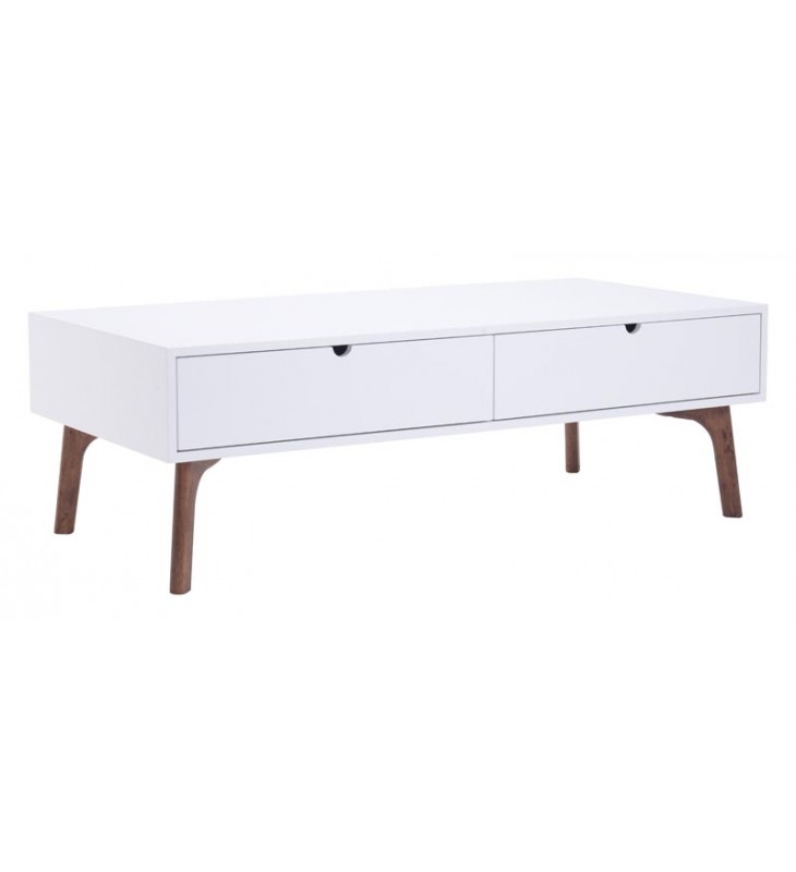Parde rectangular coffee table features a simple Mid-Century Modern profile which includes a smart double drawer design for easy storage or entertaining and is accented by a slim wood legs in warm walnut finish.
