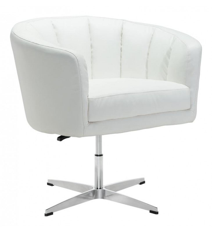 Most definitely modern, this swivel lounge chair with its channel tufting and curved back, is a must-have for any seating area in your home or office. The distressed faux leather in brilliant white beautifully compliments its sleek aluminum base. The simple lever under the seat raises and lowers you to your desired height. Also available in vintage coffee faux leather or black lux fabric.