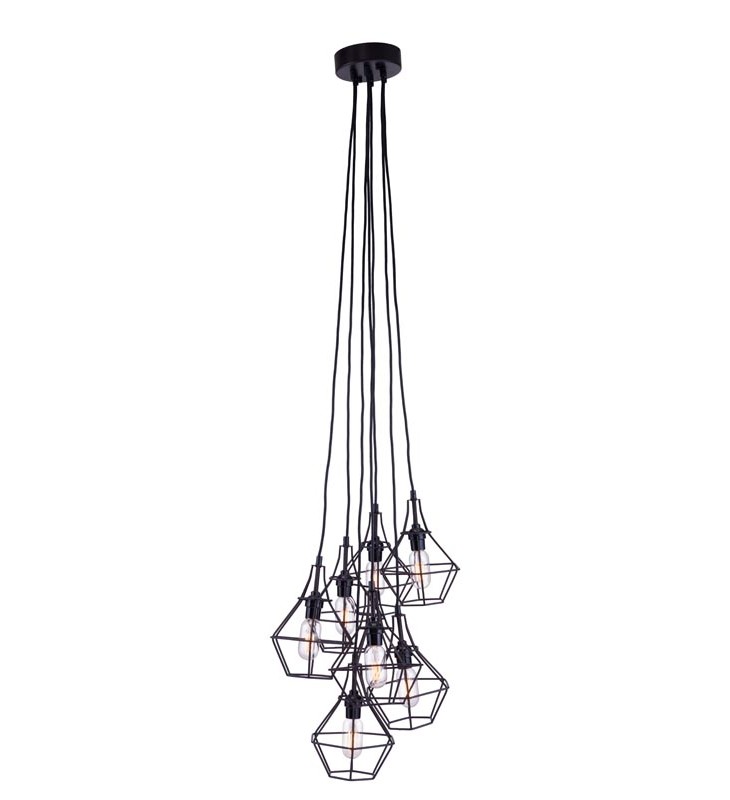Palmerston Ceiling lamp has 7 unique pendants clustered in a stagger pattern, hung by slim black cords. Each pendant has a frame work in a jeweled shape with distressed black finish metal enclosed around oblong Edison style bulbs. Glamorous or rustic, this splendid ceiling fixture will add dimension to any room regardless of the application. Bulbs not included, Matt Watt 25 W E26 Type T45 Edison. UL approved and listed.