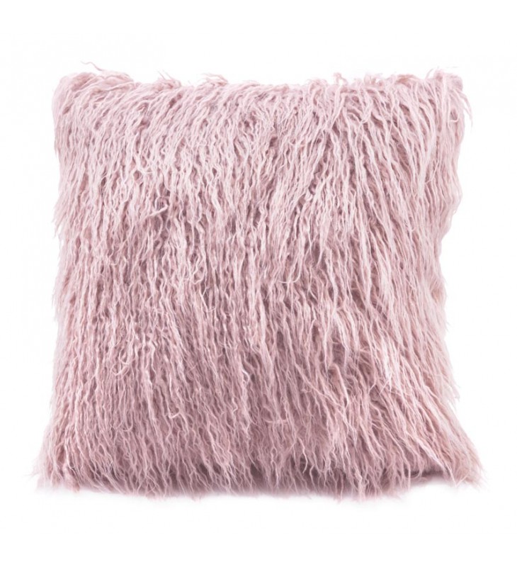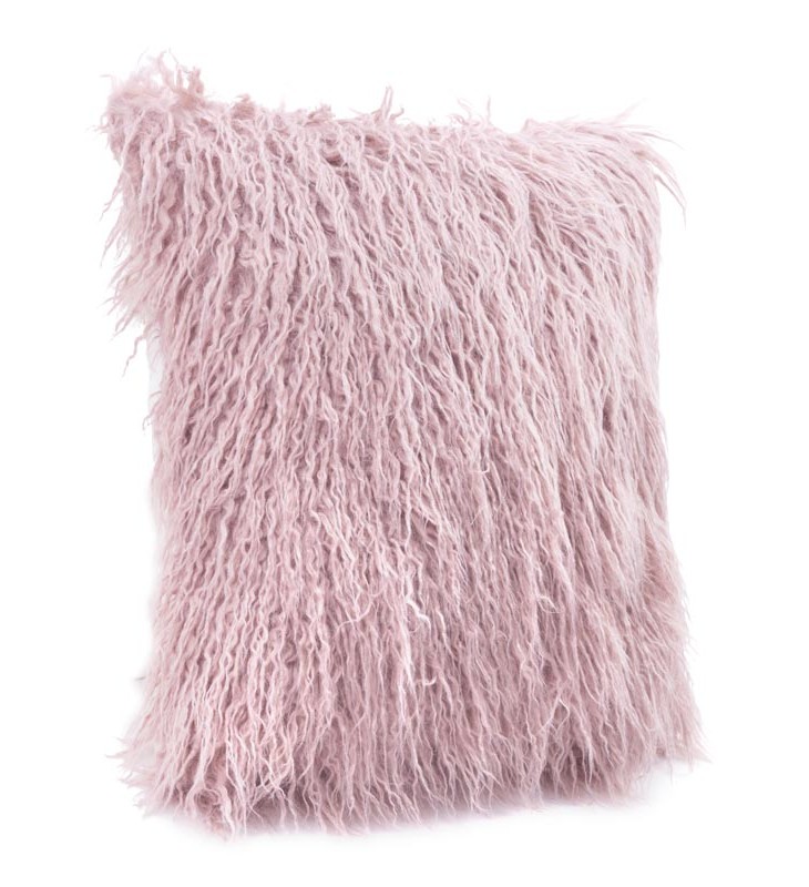 The wild side. This exotic faux fur throw pillow in on-trend pastel pink will update any room. Flip it over to expose its simpler side. Place a pair on your sofa for a cozy retreat.