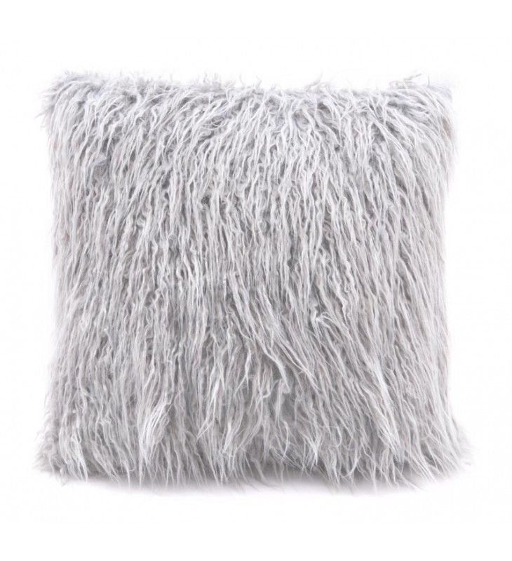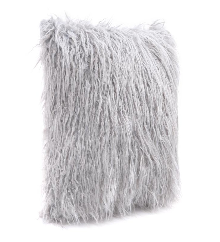 The wild side. This exotic faux fur throw pillow in neutral gray will update any room. Flip it over to expose its simpler side. Place a pair on your sofa for a cozy retreat.