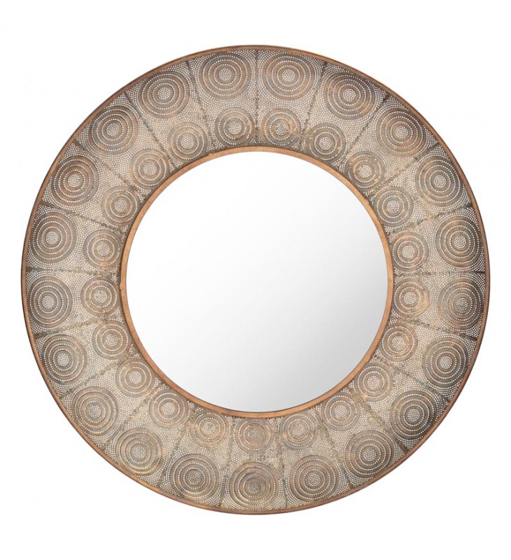 This mirror gets around, and around. Its round frame is etched with a series of concentric circles that create a pattern in motion. Distressed finish and raised texture gives it a global vibe. An eclectic addition to any room.