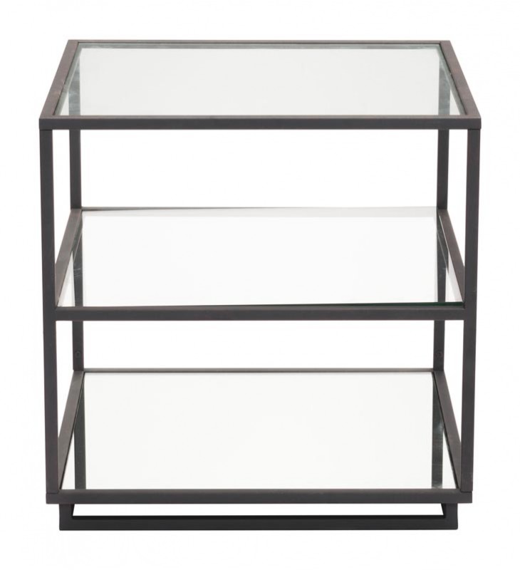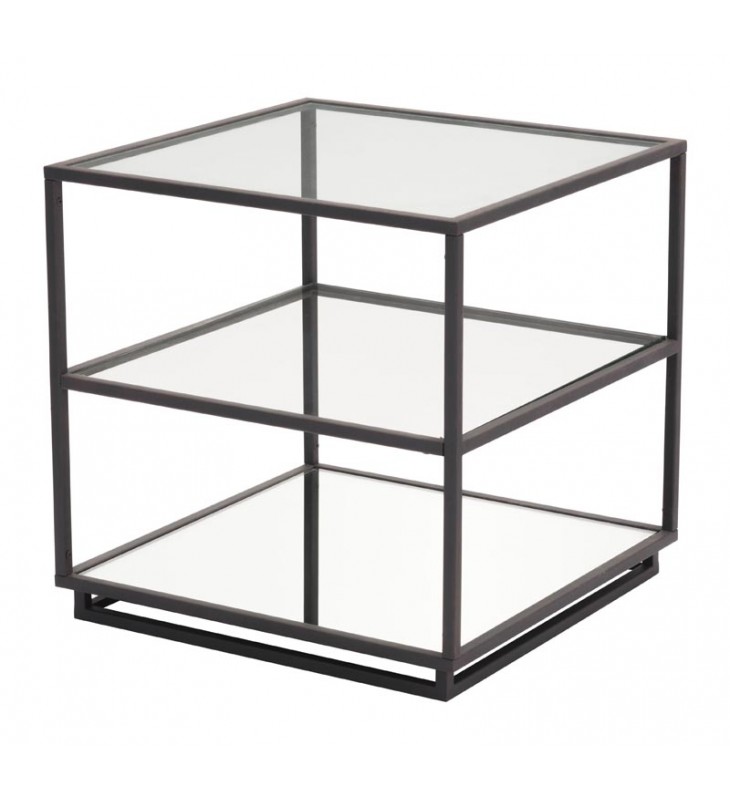A modern mix of clean lines with a distressed finish make this square end table perfect for any living space. Slim and architectural, the top two glass shelves are clear and the bottom shelf is mirrored. Place a pair by your bedside or one next to your favorite chair or sofa. Pair with the Kure console and coffee tables.